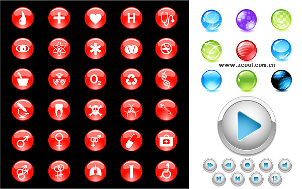 eps format, including jpg preview, keyword: Vector icons, crystal ball, the player control buttons, medical icon, male and female symbols, first aid kits, Vector material